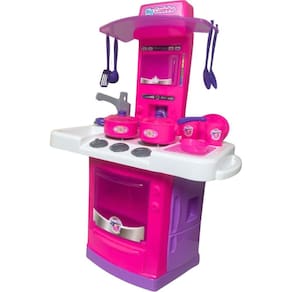 Conteúdo: 1 cozinha, 2 panelinhas com tampa, 1 travessa, 2 faquinhas, 2 garfinhos, 2 pratos, 2 copos, 1 escumadeira, 1 concha, uma espátula e uma colher além disso vem com base para reforço, proporcionando maior estabilidade.