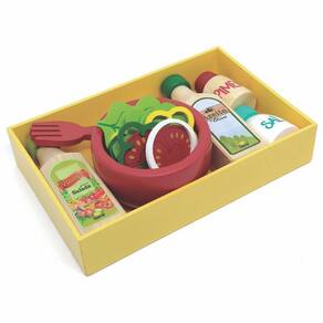 Este kit contém: vinagre, azeite, rodelas de pimentão vermelho, rodelas de pimentão amarelo, argolas grande de cebola, argolas pequenas de cebola, folhas de alface, rodelas de tomate, sal e pimenta. Junte os amiguinhos e liberte a imaginação. A coleção Brincando de Comidinha apresenta uma variedade de miniaturas, que levam a imaginação das crianças para um mundo de faz de conta, onde elas vivenciam situações do seu cotidiano de maneira lúdica e criativa. São idéias simples que resgatam valores perdidos em busca de uma infância mais feliz e saudável. Os brinquedos de madeira, são importantes pela sua resistência e capacidade de assimilar cores, além de estimular os sentidos pela sua textura, sons, peso e cheiro. Os brinquedos NewArt Toy's são confeccionados em madeira ecologicamente correta. A combinação perfeita entre a ação educativa e a preservação do meio ambiente. Ref.: 398. Material: madeira. Conteúdo da embalagem: 16 peças. Medidas do produto: C x A x L 12 x 3 x 17,5 cm. Medidas da embalagem: C x A x L 12 x 3 x 17,5 cm. Idade: a partir de 3 anos. Ean: 7909463442521