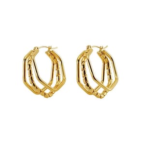META DESCRIPTION: Brinco dourado geométrico banhado a ouro 18K, moderno e elegante para qualquer ocasião.