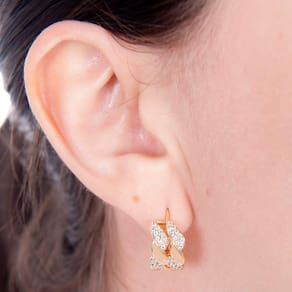 Um par de brincos de argola pequena, semijoia banhada a ouro, com aplicação de microzircônias cristal é delicado e luxuoso que te deixa em destaque em qualquer situação.