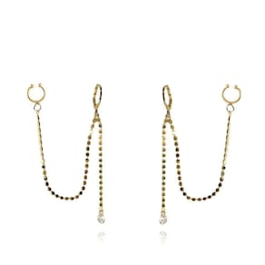 Esse brinco é composto por uma argolinha articulada e duas correntes, uma delas temos um ponto de luz e no outro um piercing fake.