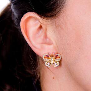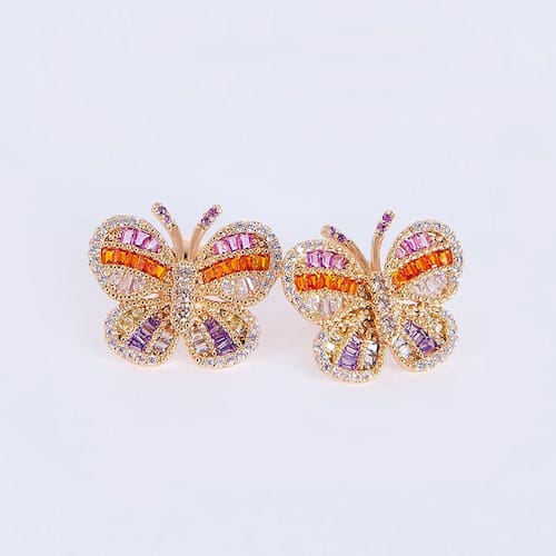 Um par de brincos em formato de borboleta, banhado a ouro, com aplicação de micro zircônias cristais e baguetes coloridas. É delicado e luxuoso que te deixa em destaque em qualquer situação.