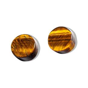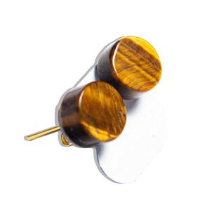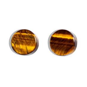 Nome da Pedra: Olho de Tigre Cor: Marrom com rajadas douradas (imagem ilustrativa) Formato da Pedra: Disco Textura e Brilho: Vitrio opaco Tamanho da Pedra: 9 mm de diâmetro Peso Total: Aproximadamente 5 quilates por par Metal: Em dourado Origem da Montagem: Produzido artesanalmente em Curvelo, Minas Gerais