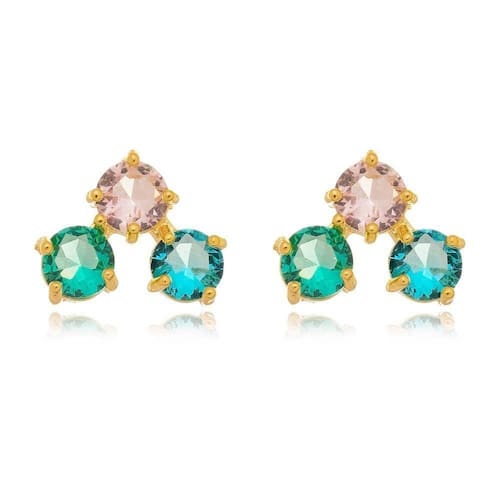Brincos deslumbrantes banhados a ouro 18k, destacados por três zircônias em tons rosa, azul e verde claro. Um acessório delicado e sofisticado, perfeito para mulheres de todas as idades. O design atemporal e o acabamento luxuoso conferem elegância a qualquer ocasião, tornando-os uma escolha versátil para elevar o estilo com um toque de brilho duradouro.