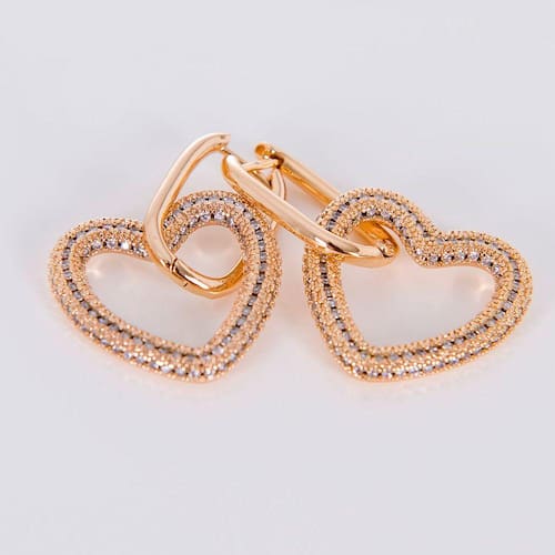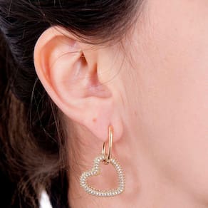 Um par de brincos com coração banhado a ouro e trabalhado em microzircônias brancas . É delicado e luxuoso que te deixa em destaque em qualquer situação.