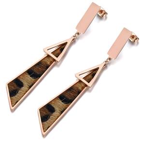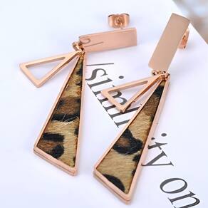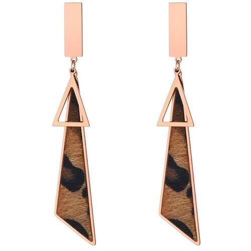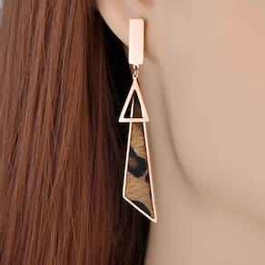 Esses brincos combinam um design geométrico sofisticado com um toque exótico, graças à estampa animal. Eles possuem uma base retangular em rosé, que se conecta a um pingente triangular alongado. O contorno em rosé cria uma moldura elegante para o interior revestido com estampa animal em tons de marrom, preto e bege, lembrando uma pele com padrão de onça ou leopardo.