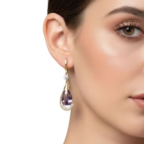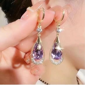 Adicione uma aura de mistério e nobreza ao seu visual com este brinco feminino de elegância singular. O destaque da peça é o cristal em tom ametista (violeta profundo), com lapidação em gota que reflete nuances de luz a cada movimento.
