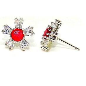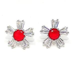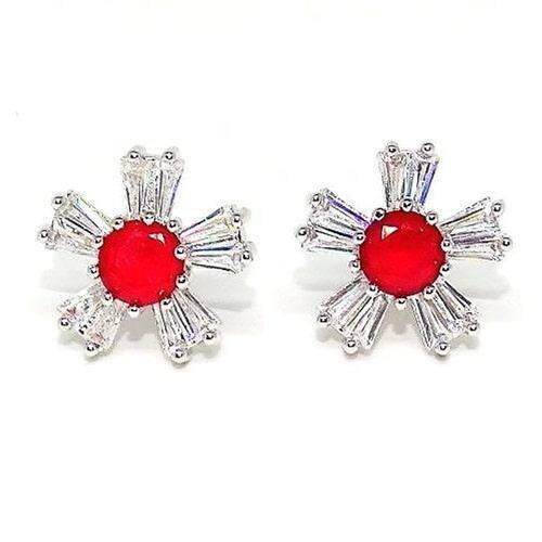 Brinco Pequeno Flor Cravejado com Zircônia Branca e Vermelha Banhado a Ródio. Delicado para seu dia a dia com glamour e sofisticação no seu Look Arrase