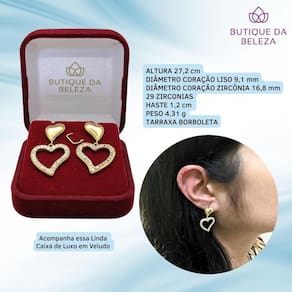 Especificações do produtoAltura 27,2mmDiâmetro coração liso 9,1mmDiâmetro coração com zircônia 16,8mm29 zircônias Haste 1,2cmPeso 4,31gTarraxa borboleta Descrição do produtoBrinco banhado a ouro 18k corações com pedras cravejadas Apresentamos a você a elegância em forma de semijoia.Peça formada por dois corações: 1 liso e outro repleto de zircônias, brilhantes sintéticos cravejados que fornecem brilho e beleza a semijoia. As zircônias são padrão aaa de qualidade e conferem ao brinco um toque de luxo.Seja para uso casual ou diurno você estará bem representada. Não perca essa oportunidade.Nós da butique da beleza temos as peças mais exclusivas para os clientes mais exigentes. O que oferecemos Um banho de ouro 18k, com qualidade , cor e tonalidade idênticas ao de uma peça de ouro 18k. Vendemos a experiência de você poder usar um produto arrojado, se sentir bela o e elevar sua autoestima. Marca: Butique Da Beleza