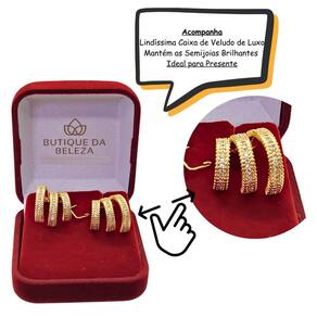 originalidade e elegância em uma só peça. . O brinco folheado a ouro possui 3 aros repletos de microzircônias cravejadas. De perfeito encaixe, esbanja brilho, pois suas zircônias são todas importadas, garantido a qualidade necessária
