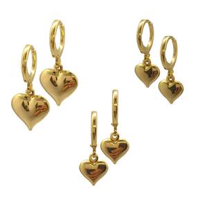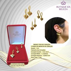um belíssico conjunto de brincos de semijoia composta por trio de argolinhas com fecho em 2 partes e 3 pingentes de corações em tamanhos diferentes, um para cada furo. Brinco leve e confortável para uso diário, muito versátil podendo fazer uso do conjunto ou brincos individuais. Confiabilidade somos a butique da beleza, empresa especializada no comércio de cosméticos e semijoias. O que oferecemos um banho de ouro 18k, com qualidade , cor e tonalidade idênticas ao de uma peça de ouro 18k. Embalagem caixa acrílica de luxo para você guardar sua semijoia e mantê-la brilhante por muito tempo. É bijuteria ou semijoia todas nossas peças são semijoias, ou seja a deposição de ouro sobre o metal pode ser até 250 vezes maior que a quantidade de ouro 18k depositada em uma peça de bijuteria. Portanto o que nós oferecemos é qualidade. As semijoias dão alergia não, nossos produtos são níquel free, cádmio free e cinza free, todos esses compostos químicos são alérgicos e estão fora de nosso processo de produção. Tem garantia sim , garantia de 6 meses mediante apresentação da de compra e certificado de garantia. Marca: Butique Da Beleza