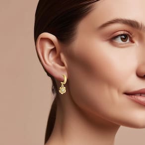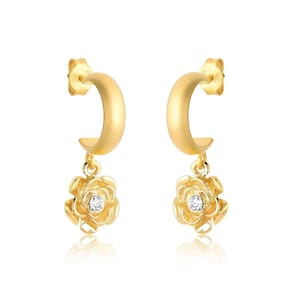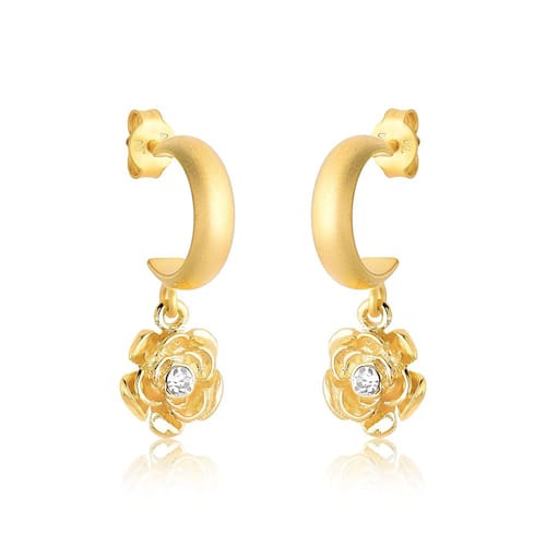 Este brinco foi elaborado com meia argola em acabamento Ouro Fosco e uma linda flor em acabamento Ouro brilhante com cristal.