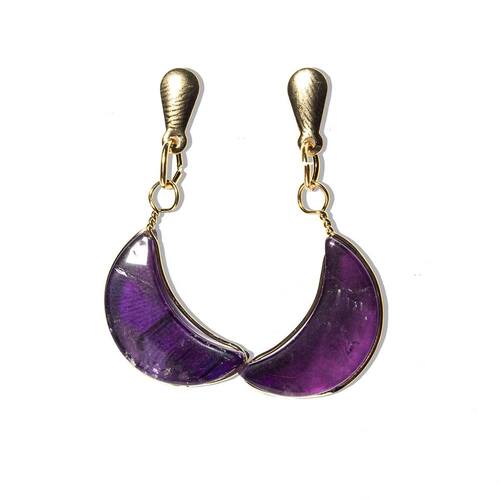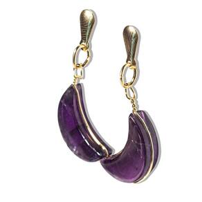 Nome da Pedra: Ametista Cor: Roxo intenso e vibrante, que transmite serenidade e equilíbrio (foto ilustrativa). Lapidação: Formato navete em meia lua, com polimento artesanal. Claridade: Opaco, sem transparência. Medida das Pedras: 7 mm e 10 mm. Medida Total do Brinco: Aproximadamente 4 cm. Peso: Cerca de 2 g por lado. Material da Montagem: Metal niquelado em flash dourado. Origem: Produzido artesanalmente em Curvelo, Minas Gerais.