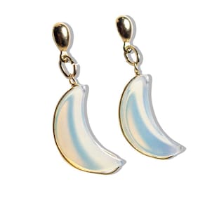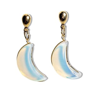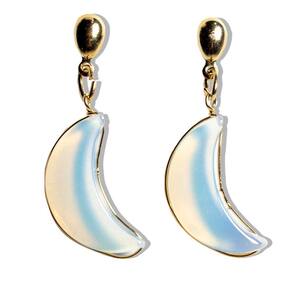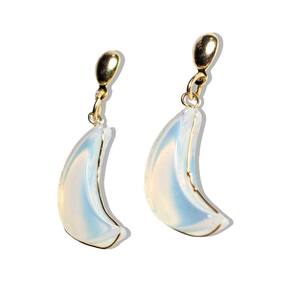 Nome da Pedra: Pedra da Lua Opalina. Cor: Branco opalado com brilho sutil (foto ilustrativa). Lapidação: Formato navete em meia lua, com polimento artesanal. Claridade: Vítreo semi-brilhoso, encantador sob diferentes luzes. Medida das Pedras: 7 mm e 10 mm. Medida Total do Brinco: Aproximadamente 4 cm. Peso: Cerca de 2 g por lado. Material da Montagem: Metal niquelado em flash dourado. Origem: Produzido artesanalmente em Curvelo, Minas Gerais, com pedras de origem importada.