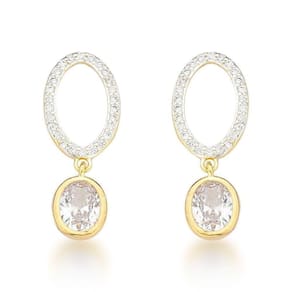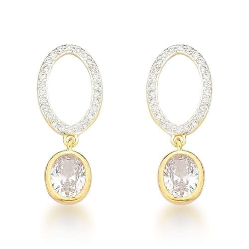 Deslumbre com estes brincos delicados, banhados a Ouro 18k, apresentando um design oval vazado e uma Zircônia oval maior na parte inferior. Perfeitos para eventos especiais e para adicionar um toque de glamour ao seu visual.