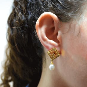 As pérolas na ponta do pêndulo conferem um charme atemporal a essa peça, combinando perfeitamente com a tonalidade vibrante do ouro 18K. O movimento suave e elegante do pêndulo cria um efeito cativante, que certamente chamará a atenção.