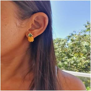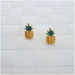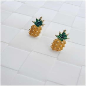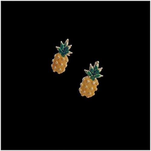 Brinco pequeno em formato de abacaxi esmaltado em verde e amarelo.