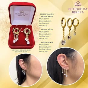 Brinco trio feminino folheado a ouro argola e pedra zircônia degrade e caixa de luxo