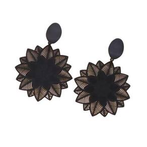 Lindo par de brincos em formato de circulo com flores em renda na cor preto, formato semelhante uma mandala, perfeito para qualquer ocasião, com a elegância da beleza feminina. Peças de excelente qualidade, com muita personalidade. Detalhes: material de liga de zinco, de excelente qualidade. Tamanho: 6,5 cm x 4,5 cm origem: produto importado