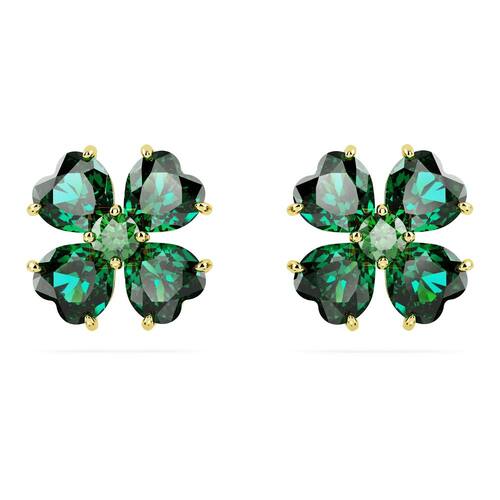 SWAROVSKI Coleção de joias de cristal Idyllia Clover, Cristal, Cristal - Medidas: Tamanho: 1,2 x 1,2 cm, Peso (peça individual): 1,1 g - Um mundo de maravilhas espera: faça todos os dias com estes encantadores brincos dourados com acabamento em tom dourado com um trevo verde vibrante feito de quatro cristais em forma de coração dispostos em torno de uma pedra central - Versátil e apelativo: se você se vestir bem ou se vestir, estes brincos modernos irão melhorar qualquer roupa com seu design gracioso e inspirado na natureza e cristais brilhantes - A arte encontra a imaginação: combine estes brincos com um visual monocromático para fazê-los realmente se destacar, apresentando um metal brilhante com acabamento dourado e design de cristal cravejado que irradia beleza sutil - Projetado para durar: as joias Swarovski mantêm seu brilho quando práticas simples de cuidado são observadas; remova antes de entrar em contato com água, loções ou perfumes e polir com um pano sem fiapos - Itens entregues: (1) Conjunto de brincos Swarovski Idyllia com motivo de trevo com pedras verdes em um acabamento dourado, completo com caixa de brincos Swarovski