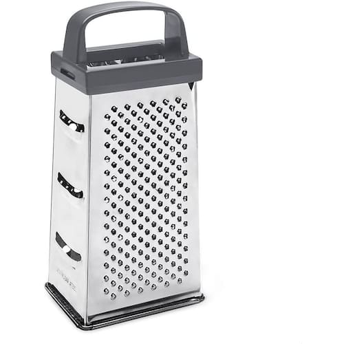 Seus 4 lados, permitem ralar alimentos em diversos formatos e espessuras. Seu corpo em aço inox, garante durabilidade, e eficiência, além de ser mais fácil de limpar. Com alça em poliestireno na cor cinza, o ralador de 4 faces da Brinox possui 10,6X8,1X22,5 cm. Leve muito mais praticidade e beleza para sua cozinha com o Ralador de inox 4 faces da Brinox.