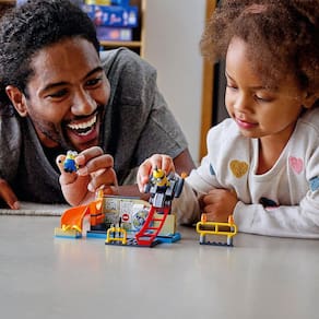 - Com este jogo infantil LEGO Minions, os pequenos podem deslizar os Minions para o laboratório, testar o veículo de brinquedo ou usar o botão na parte traseira da máquina de lavar para girá-lo