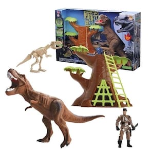 Um playset com vários itens incríveis! Um grande T-rex feroz, uma árvore cheia de misterios, um caçador e uma cartelinha de antigos fósseis. O T-rex é inteiro em vinil macio e atóxico, além de articulação dos membros. A árvore contém um esconderijo secreto!