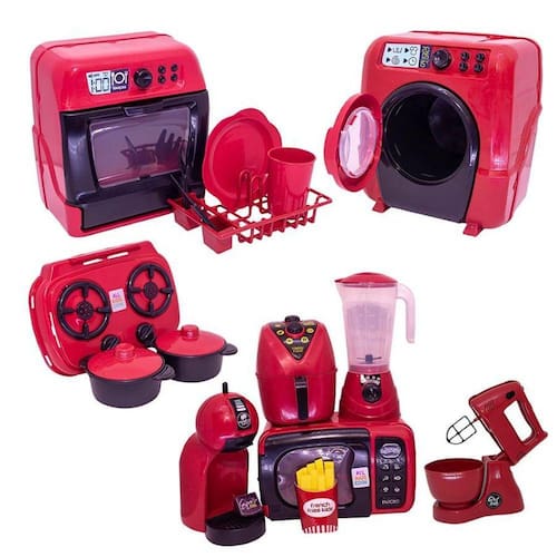 --------------------------------------------------------------------------------------------- - 1 maquina de lavar roupa de aproximadamente 17 cm de comprimento x 14 cm de altura --------------------------------------------------------------------------------------------- - 1 maquina de lavar louças de aproximadamente 18 cm de comprimento x 16 cm de altura com talheres, copo e pratinho --------------------------------------------------------------------------------------------- - 1 fogão cooktop tamanho 21 cm de comprimento x 15 cm de largura com 2 panelinhas