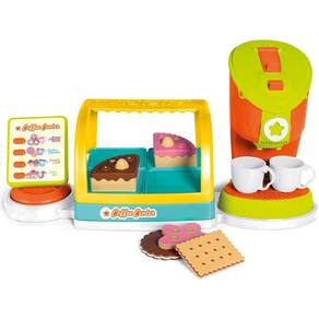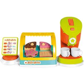 -É uma cafeteria completa, vem com uma estufa recheada de docinhos e duas xícaras, e um painel que gira 360° para brincar de comprar e vender.