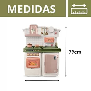- Na embalagem contém: 01 cozinha completa com fogão, geladeira, micro-ondas, pia com torneira, prateleira e coifa, 01 panela com tampa, 01 frigideira com tampa, 02 pratos, 02 taças, 02 colheres, 02 garfos, 01 escumadeira, 01 concha e 01 espátula.