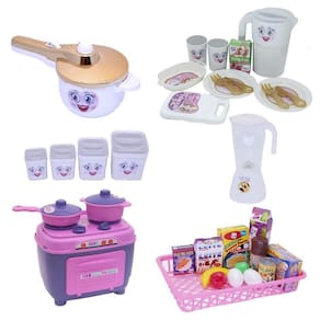 O kit vem com fogão com panelas, jogo de jantar, mercadinho, panela de pressão, potinhos de mantimentos, liquidificador