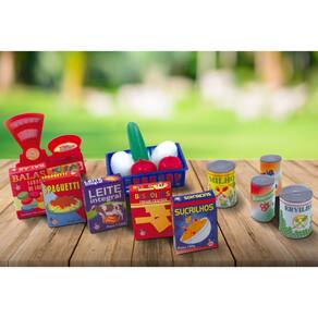 Contém: 1 balança, 1 caixinha de spaguetti, 1 caixinha de leite, 1 guaraná, 1 lata de milho, 1 caixinha de biscoito, 1 caixinha de sucrilhos, 1 caixinha de bala, 1 lata de ervilhas, 1 suco de laranja, 1 cesto, 2 maças, 1 pepino e 2 ovos.