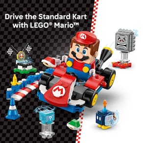 - Jogo de corrida interativo – Jovens construtores podem usar o boneco interativo do LEGO Mario para ganhar recompensas digitais da caixa de itens, derrotar os bonecos Bob-omb e Thwomp e acionar efeitos sonoros e visuais de Mario Kart colocando-o no kart padrão