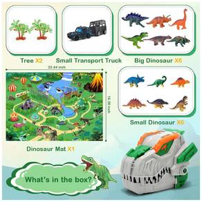 O Conjunto Completo de Dinossauros inclui 12 figuras realistas de dinossauros, uma cabeça de dinossauro removível que se transforma em um cenário, um caminhão de transporte de 2 partes, um mapa do parque dos dinossauros e 2 árvores. Cada dinossauro é colorido, detalhado e de espécies variadas, tornando este conjunto de brinquedos de dinossauro perfeito para estimular a imaginação das crianças. Crie seu Próprio Mundo de Dinossauros: as crianças podem usar a cabeça de dinossauro removível e o mapa para criar sua própria aventura pré-histórica. Esta configuração interativa dá vida à terra dos dinossauros, incentivando a criatividade, narração de histórias e brincadeiras imaginativas. Diversão Educacional: as 12 figuras realistas de dinossauros ajudam as crianças a aprender nomes, formas e características de dinossauros enquanto brincam. Esta abordagem de aprender brincando melhora a memória e o conhecimento, tornando-o um brinquedo educativo ideal para as crianças. Seguro e Durável: Feito com materiais premium, não tóxicos e duráveis, com bordas lisas e arredondadas para uma experiência de brincar segura. Em conformidade com os padrões de segurança de brinquedos infantis, garantindo que as crianças possam desfrutar de horas de diversão sem preocupações. Presente Perfeito para Qualquer Ocasião: Ótimo para aniversários, Natal, Páscoa, Halloween, Ano Novo, festas com tema de dinossauro, decorações de bolo ou como item de coleção. Adequado para meninos e meninas a partir de 3 anos.