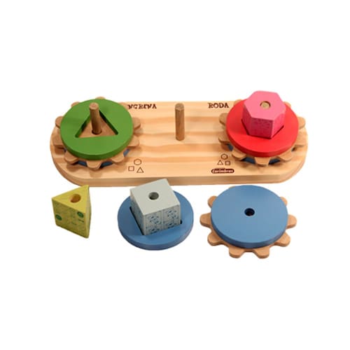 O Engrena Roda trabalha a exploração dos conceitos de nomeação, identificação, comparação, diferenciação e descrição. No brinquedo a criança encontra formas, cores, conta pequenas quantidades, demonstra conceitos em cima/embaixo, longe/perto, dentro/fora, muito/pouco, cheio/vazio e mais/menos.