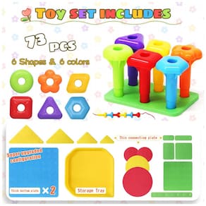 O brinquedo de encaixe pegboard com 73 peças foi desenvolvido para atividades de empilhamento, encaixe e construção simples em placas de base, estimulando organização espacial e coordenação motora fina em crianças. As peças permitem montar estruturas em diferentes alturas, criar pontes entre placas e formar desenhos com combinações de cores e formas, adequadas para uso doméstico e em salas de aula de educação infantil. A proposta segue princípios de atividades tipo STEM e Montessori, priorizando exploração sensorial, classificação de elementos e primeiros exercícios de contagem e sequência.