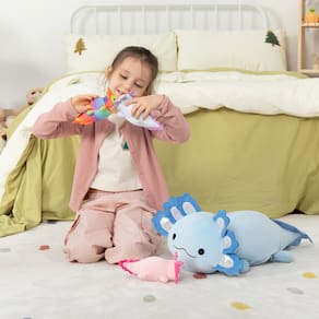 Apresentamos o Axolote Gigante de Pelúcia MaoGoLan de 4 Peças com 3 Bebês Dentro! Esta adorável coleção de pelúcia é um item essencial para qualquer amante de axolotl, crianças e adolescentes. Com seu design exclusivo com 4 axolotes gigantes e 3 bebês escondidos dentro de seus corpos macios, este produto oferece um charme irresistível. Feitos com materiais de qualidade premium, estes brinquedos de pelúcia são ultramacios e aconchegantes, proporcionando uma experiência tátil encantadora. Se você quiser se aconchegar com eles ou usá-los como travesseiros, seu tamanho grande de 59,7 cm garante o máximo de conforto e satisfação. Estes bichos de pelúcia axolotl macios e abraçáveis rapidamente se tornarão seus companheiros preferidos para relaxar e brincar. Estes brinquedos de pelúcia não apenas oferecem horas de diversão sem fim, mas também são um presente perfeito para qualquer entusiasta de axolote. Sua cor azul claro adiciona um toque de capricho e charme, tornando-os uma adição encantadora à decoração de qualquer cômodo. Se você está procurando um presente de aniversário, presente de Natal ou apenas algo para mostrar a alguém o quanto você se importa, esta coleção de pelúcia certamente trará alegria e sorrisos para seus rostos. Se você é fã de axolotls ou conhece alguém que é, o Axolote Gigante de Pelúcia MaoGoLan de 4 Peças com 3 Bebês Dentro é uma escolha encantadora. Então, por que esperar? Traga para casa essas criaturas adoráveis hoje e deixe os abraços e aventuras começarem! - MaoGoLan Brinquedos Axolotl de design autêntico exclusivo: nossos designers usaram o anfíbio AXOLOTL como o protótipo de design para este adorável brinquedo de pelúcia da família axolote. Os amantes do axolote não devem perder esta série de coleção axolote macia e exclusivamente projetada para mãe e filho! - Material macio para a pele: nossa pelúcia axolote grande é feita de tecido macio, de pelo curto, preenchido com algodão PP, que é seguro e super macio, com um toque de marshmallow. Material amigo da pele, você não precisa se preocupar com o material causando um efeito ruim na pele do seu filho. O toque super macio é adequado para abraçar e inclinar, sinta-se à vontade para deixar seu filho abraçar nossos brinquedos macios de travesseiro axolote para dormir! - Companheirismo é o melhor presente: seja uma criança ou um adulto, eles vão adorar este brinquedo de pelúcia macio e fofinho da série axolotl. Divirta-se juntos, compartilhe felicidade e segredos. Nossos lindos bichos de pelúcia axolotl gigantes para mãe e criança são o presente perfeito para qualquer feriado ou qualquer ocasião. Seria ótimo compartilhar a alegria e o calor com os outros! - Decorativo e funcional: este axolote de pelúcia não é apenas um companheiro fofo e fofinho, mas também serve como um travesseiro decorativo, adicionando um toque de capricho e charme a qualquer cômodo. - Brinquedos educativos: esta pelúcia axolote não é apenas adorável e divertida, mas também serve como um brinquedo educativo, ensinando as crianças sobre as espécies únicas e fascinantes de axolotl.