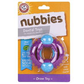 O brinquedo dental Arm & Hammer Nubbies Orion para cães é o brinquedo dental ideal para cães para transformar o comportamento destrutivo em brincadeiras produtivas e positivas. Infundido com bicarbonato de sódio para eliminar naturalmente os odores, este brinquedo para cães é feito com nylon e TPR para maior durabilidade. É um ótimo brinquedo para cães para mastigadores leves a médios. As protuberâncias e ranhuras ajudam a limpar os dentes sem uma escova de dentes. Além disso, os cães adoram o sabor de menta fresca. Os cães gostam de mastigar para melhorar a saúde bucal com o Arm & Hammer Orion Toy.Este brinquedo dental para cães é uma ótima maneira de recompensar seu cão com um brinquedo para cães que continua dando. Ele transforma a mastigação em uma brincadeira positiva enquanto ajuda a limpar os dentes do seu cão. Esta ferramenta dental para mastigar para cães ajuda a remover a placa bacteriana e o tártaro dos dentes do seu cão enquanto os cães mastigam.Tal como acontece com todas as ferramentas dentárias para cães, ao selecionar o seu brinquedo para mastigar Arm & Hammer, é importante selecionar o tamanho adequado e o brinquedo para mastigar para a idade, força de mastigação e peso do seu cão. Como acontece com todos os brinquedos para mastigar para cães, supervisione o uso e remova todas as peças separadas.Sabor: Mint / MentaIndicado para cães até 15 kgMedidas Aproximadas: 10,5 x 10,5 cm Marca: Arm&hammer