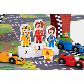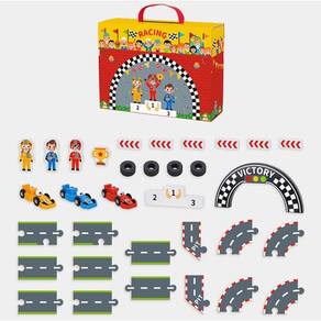 Quando aberta, é só pegar as 34 peças e montar o cenário com pista e carrinhos de corrida.