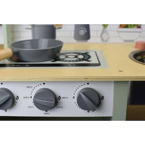 Este brinquedo com tudo incluído possui forno, fogão e pia, permitindo que as crianças se envolvam em aventuras culinárias imaginativas. O conjunto vem completo com utensílios de cozinha de madeira e plástico, uma panela e uma frigideira, proporcionando aos chefs mirins tudo o que precisam para preparar deliciosas refeições de faz de conta. A bancada e as prateleiras de madeira oferecem amplo espaço de armazenamento para todos os itens culinários, enquanto as quatro pernas de madeira garantem estabilidade durante a brincadeira. Com este brinquedo, as crianças podem criar o seu próprio cenário de cozinha, experimentando diferentes receitas, praticando os seus dotes culinários e explorando a alegria da preparação dos alimentos. É uma maneira fantástica de incentivar a criatividade, a encenação e a interação social enquanto eles servem suas criações culinárias para familiares e amigos.