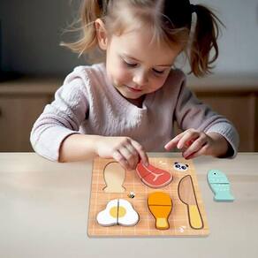 A mãe pode ensinar o bebê a reconhecer vários objetos. O bebê pode cortá-los ao meio, um por um, com a faca de madeira para descascar e colocá-los no quebra-cabeça. Esses quebra-cabeças de madeira para crianças têm padrões claros e realistas, que podem estimular a visão e a curiosidade das crianças.