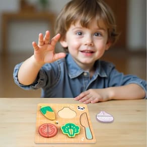 Descrição do Produto Contém 4 tipos de objetos e uma faca de madeira para descascar. A mãe pode ensinar o bebê a reconhecer vários objetos. O bebê pode cortá-los ao meio, um por um, com a faca de madeira para descascar e colocá-los no quebra-cabeça. Esses quebra-cabeças de madeira para crianças têm padrões claros e realistas, que podem estimular a visão e a curiosidade das crianças. Adequados para crianças de 1 a 5 anos para melhorar sua coordenação olho-mão enquanto brincam.