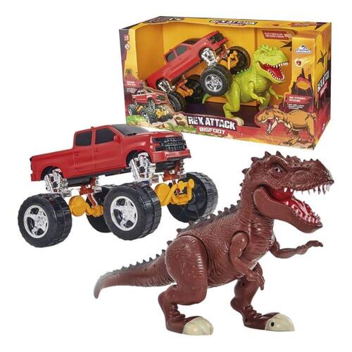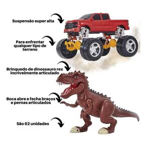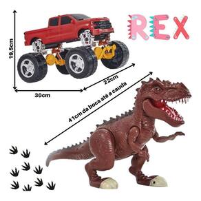 Especificações: Marca: adijomar Modelo: rex attack bigfoot Material: plástico Idade: +3 anos Tamanho: grande Quantidade de peças: 02 Altura da boca até a cauda: 41cm Altura de carro: 19,5cm Largura de carro: 22cm Comprimento de carro: 30cm Com som: não Com luz: não Com pilha: não