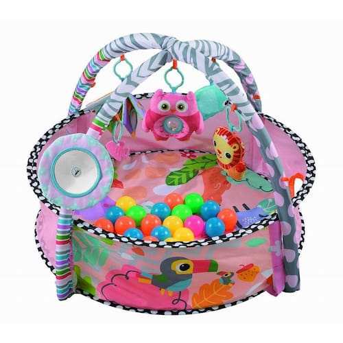 Características: - Tapete macio para maior conforto e que se transforma em uma piscina de bolinhas - Estimula os sentidos: Os sons aprimoram a habilidade auditiva. As cores e texturas oferecem um ótimo estímulo visual e tátil. - Várias maneiras de montar e o bebê pode ficar em diversas posições - Totalmente portátil, as peças são fáceis de montar e desmontar - Material atóxico e lavável - Livre de BPA - Cor: Rosa - Tamanho do tapete: 70cm de circunferência