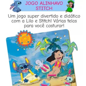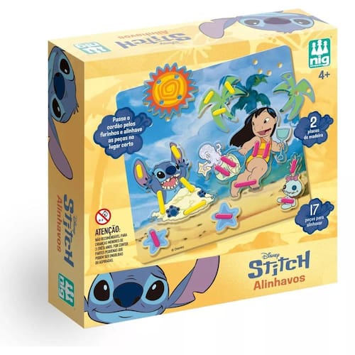 O jogo educativo Alinhavos Stitch Disney, Nig Brinquedos é uma atividade lúdica e educativa que visa desenvolver a coordenação motora fina, a concentração e a criatividade das crianças a partir de 3 anos. O conjunto inclui 17 figuras do Stitch em madeira, 2 placas de madeira, 6 cadarços coloridos. A criança deve passar os cadarços pelos furinhos das peças, estimulando habilidades essenciais para o aprendizado da escrita.