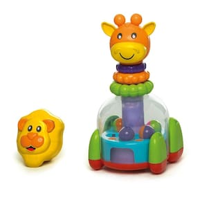 Surpresa Divertida: Ao apertar a cabeça do bichinho (leão ou girafa), a base do brinquedo gira e as bolinhas coloridas saltam, criando um efeito visual e sonoro que estimula a percepção auditiva e a curiosidade.