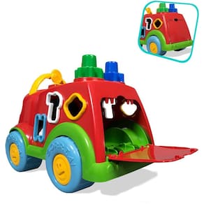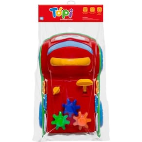 Na parte de trás do produto tem uma porta que simula um “porta-malas” para o bebê brincar de retirar as pecinhas por lá. Em cima do caminhão tem engrenagens coloridas que giram de um lado ao outro, alavanca e chave que fazem barulho de "crec crec".