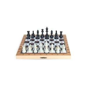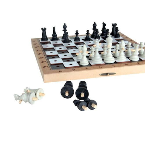 - Estojo tabuleiro com fecho metálico, relevo e orifícios, tabuleiro/estojo serigrafado quadrantes claros branco em alto relevo e escuros preto em baixo relevo , com 32 peças para o xadrez 16 peças tem cavilha fixas na lateral para diferenciar as peças claras das escuras , todas as 32 peças apresentam cavilhas fixas abaixo de cada uma para encaixe/apoio nos orifícios do tabuleiro Rei encaixado no tabuleiro mede 9,5 cm de altura .