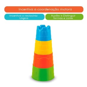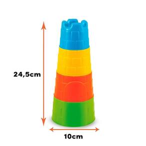 Apresentamos nossa incrível torre em formato de castelo, colorida e encantadora, com 04 peças para empilhar Perfeita para estimular a imaginação e a coordenação motora dos pequenos.