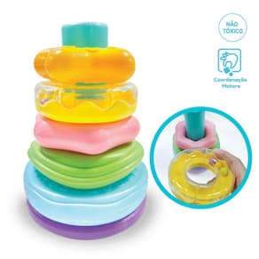 A Torre Baby é um brinquedo clássico e educativo, projetado para estimular o desenvolvimento sensorial e motor dos bebês. Composta por 6 anéis coloridos de diferentes tamanhos e formas, esta torre oferece uma experiência de aprendizado interativa. Os bebês podem segurar e empilhar os anéis na base, do maior para o menor, desenvolvendo habilidades motoras finas e coordenação mãos-olhos enquanto se divertem. Além disso, os anéis coloridos proporcionam estímulo visual e tátil, promovendo o reconhecimento de cores e formas desde cedo.